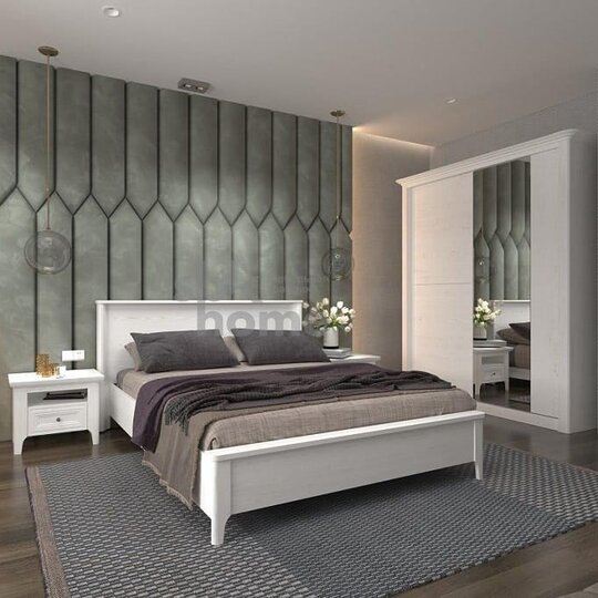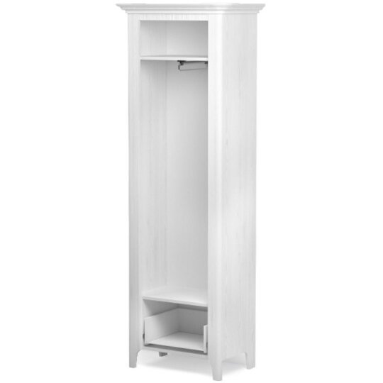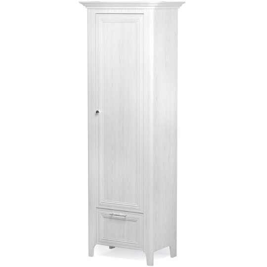 Декор представляет собой сочетание рисунка слегка брашированной древесины и включений в виде сучьев, которое не бросается в глаза и не выглядит слишком ярким, имеет очень светлый, почти полностью белый оттенок. Шкаф дополнен декоративным карнизом. Направление открывания двери определяется при сборке. Высота ножек 110 мм.