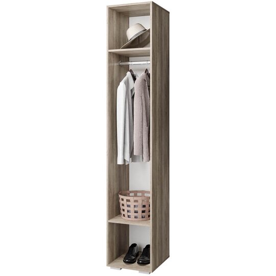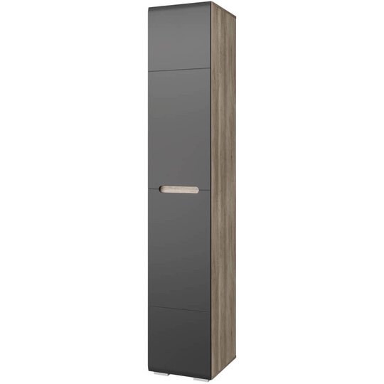 Дополнительным местом хранения вашего гардероба может стать пенал Наоми. Внутренне наполнение модели состоит из отделения для одежды на вешалках и двух полок, белый/серый фасад дверцы и корпус цвета дуб каньон позволят изделию вписаться в любую комнату и украсить современный интерьер.