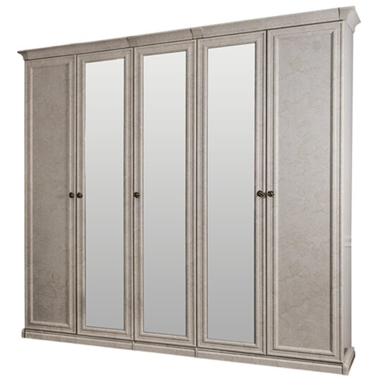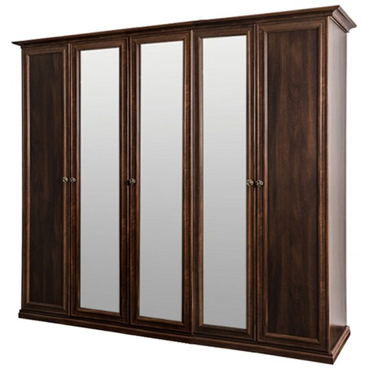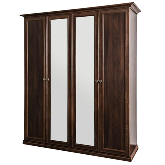 Шкаф с зеркалами Афина - выполненный в строгом классическом стиле двухстворчатый шкаф оборудован штангой для вешалок и антресольной полкой за двумя распашными дверцами. Шкаф декорирован резным карнизом, монолитным основанием, лаконичными накладками на фасадах и оригинальными металлическими ручками в виде розочек.