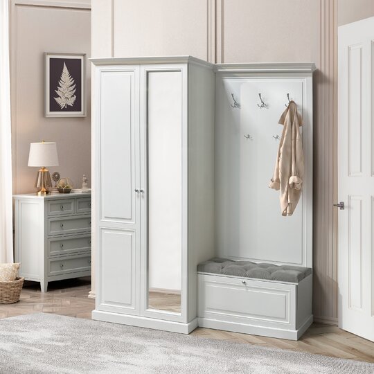 Вместительный шкаф, надежные крючки, позволят разместить верхнюю одежду, уличную и домашнюю обувь , сезонные аксессуары и головные уборы, а наличие мягкого сидения добавит комфорта от ежедневных сборов перед выходом на улицу.