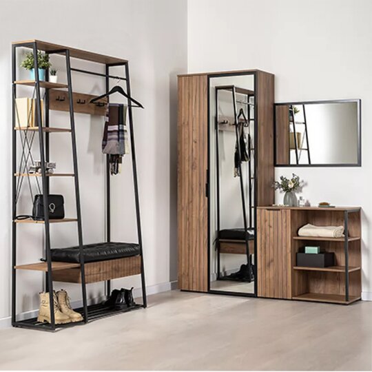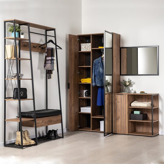 Компактная прихожая Гранд - практичное решение в стиле Лофт. Металлические стойки, открытые полки и вертикальные линии на фасадах создают ощущение легкости и воздуха. Выдвижная усиленная штанга в шкафу обеспечивает компактное хранение верхней одежды. Направляющие и петли оснащены доводчиками. Сиденье с мягким элементом позволит комфортно переобуться, а съёмная металлическая полка для обуви значительно упрощает уборку.