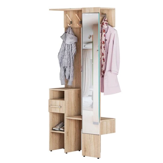 Прихожая Лига – идеальный выбор для небольшого пространства. Модель выполнена в цвете дуб сонома и будет прекрасно смотреться в современном интерьере, вы с легкостью сможете расположить в ней все необходимые предметы гардероба благодаря открытым полкам, выдвижному ящику и зоне с крючками, зеркало во весь рост – очень функциональное решение.