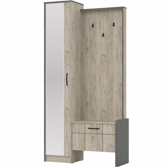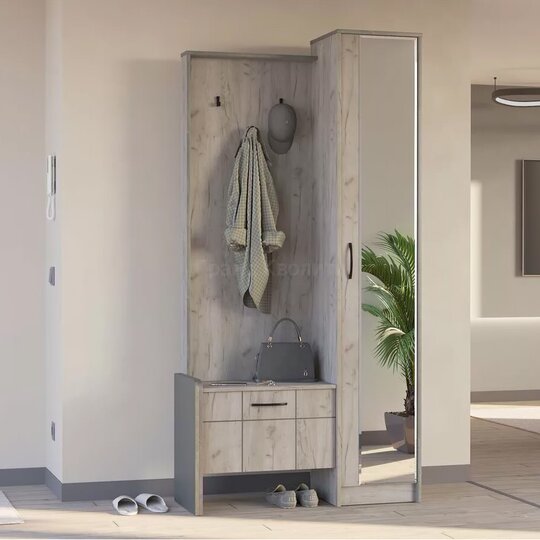 Прихожая Лофт 2-3439 поможет обустроить маленькую прихожую или коридор в современном интерьере. Прихожая состоит из одного шкафа с двумя ящиками. Крючки и выдвижная штанга в шкафу предназначены для размещения верхней одежды, а антресольные полки пригодятся для головных уборов и шарфов. Нижняя ниша с ящиками используется для размещения обуви и аксессуаров вашей семьи. Небольшое зеркало на двери шкафа используется во время переодевания, а также перед выходом из дома, что убедит вас в том, что выглядите вы неотразимо.