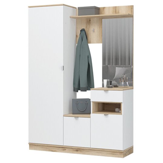 Прихожая Юкки ПР 1400 - это функциональное и стильное решение для организации пространства прихожей. Изготовлена из высококачественного и прочного материала ЛДСП, обеспечивая долговечность и надежность конструкции. Цвет прихожей белый с оттенком дуба делано, что придает ей современный и элегантный внешний вид