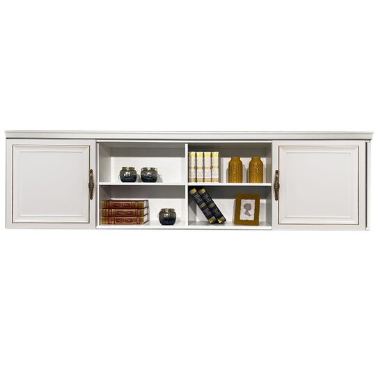 Внушительных размеров навесная секция для добавления комфорта зоне отдыха и размещения между шкафными секциями коллекции детской мебели Натали. Секция выполнена в белой глянцевой тонировке с центральными нишами и с двумя боковыми отделениями для хранения за передвижными дверцами. Фрезерованные рамочные фасады декорированы золотой патиной и ручками-скобами цвета состаренного золота.