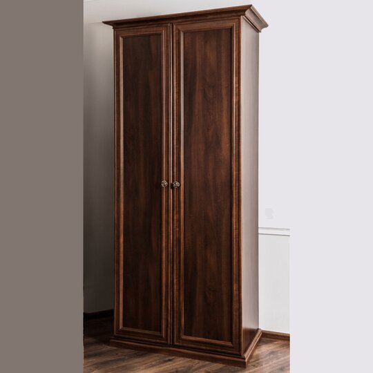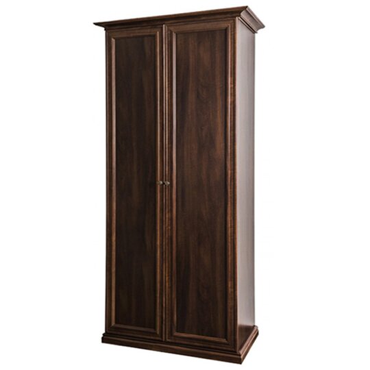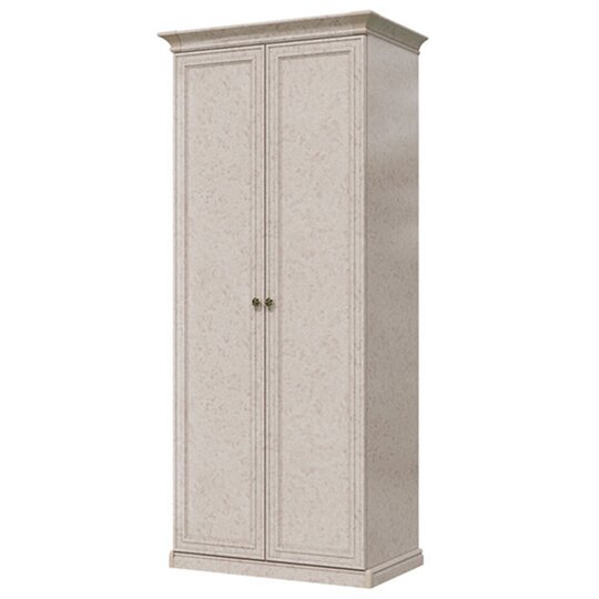 Шкаф Афина - выполненный в строгом классическом стиле двухстворчатый шкаф оборудован штангой для вешалок и антресольной полкой за двумя распашными дверцами. Шкаф декорирован резным карнизом, монолитным основанием, лаконичными накладками на фасадах и оригинальными металлическими ручками в виде розочек.