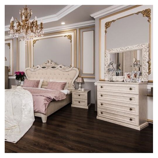 Мебель из коллекции Афина впечатляет изысканностью и элегантностью. Корпус из ламинированной ДСП, итальянский шарм и французское очарование — всё это органично раскрывается в роскошном интерьере спальни.