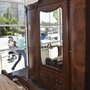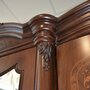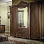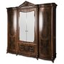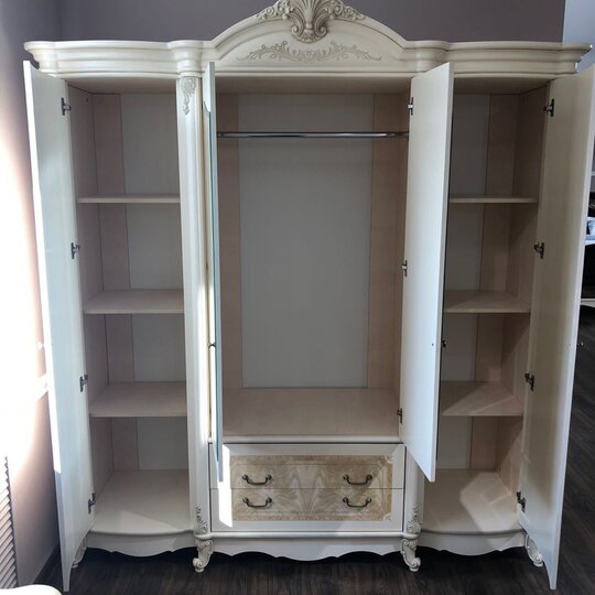 Шкаф Илона-достойный дворцовых интерьеров шикарный шкаф с тремя отделениями за четырьмя распашными дверцами. Центральное отделение оснащено стационарной штангой за двумя распашными дверцами с зеркалами, декорированными фацетом. Под центральным отделением расположено два выдвижных ящика. Боковые отделения оснащены полками за распашными дверцами.
