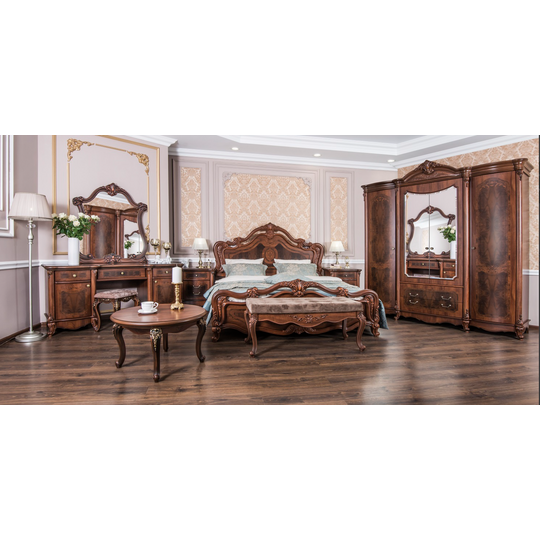 Спальня Илона выполнена в роскошном стиле «rococo». Сочетание элегантности форм , классического оформления и высоко художественного исполнения сериграфических композиций (шелкография) создает из спальни истинный шедевр , в котором искусство доведено до совершенства.
