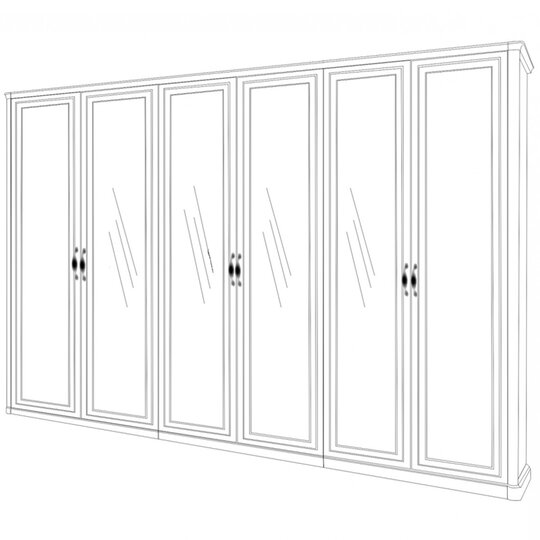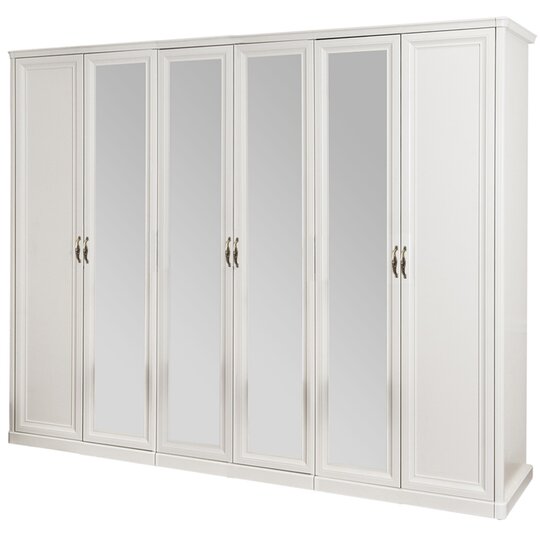 Шкаф 6-ств Натали - роскошный пятистворчатый шкаф с двумя "глухими" боковыми и тремя центральными, оснащенными зеркалами, распашными дверцами выполнен в классическом стиле в белой глянцевой тонировке с рамочными фасадами, декорированными золотой патиной и ручками-скобами цвета состаренного золота. Наполнение шкафа выбирается при сборке: полки  или штанга с антресольной полкой (Вар.а или Вар.б). Для наполнения Вар.в (см. рисунок Наполнение 2-ств секции) необходимо дополнительно приобрести модуль Полки со штангой из коллекции Спальни Натали. Шкаф скомпонован из двух двустворчатых и одной одностворчатой секций и укомплектован завершающими стоевыми из комплекта спальни Натали.