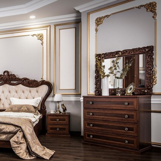 Мебель из коллекции Афина впечатляет изысканностью и элегантностью. Корпус из ламинированной ДСП, итальянский шарм и французское очарование — всё это органично раскрывается в роскошном интерьере спальни.