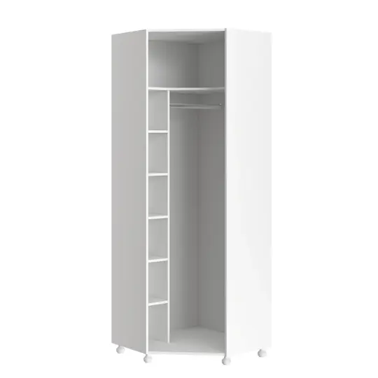 Шикарный угловой распашной шкаф с шестью полками и одной штангой для вешалок. Особый шарм шкафу придает уникальный объемный фасад с 3D накладками. Высота опоры 65 мм.