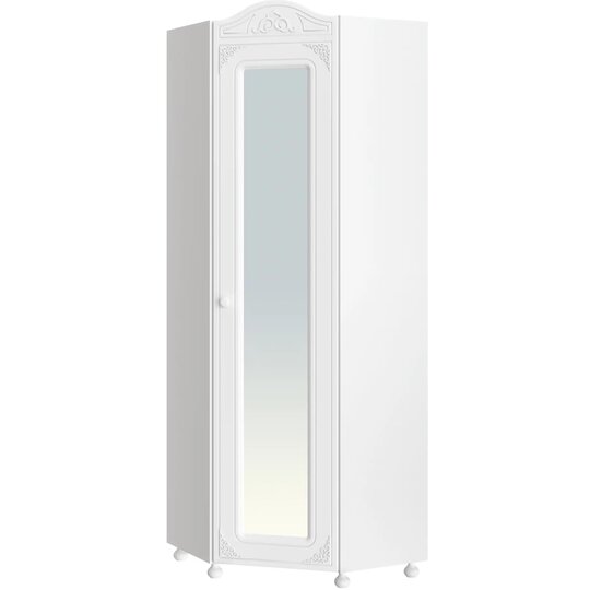 Шикарный угловой распашной шкаф с шестью полками и одной штангой для вешалок. Особый шарм шкафу придает уникальный объемный фасад с 3D накладками. Высота опоры 65 мм.
