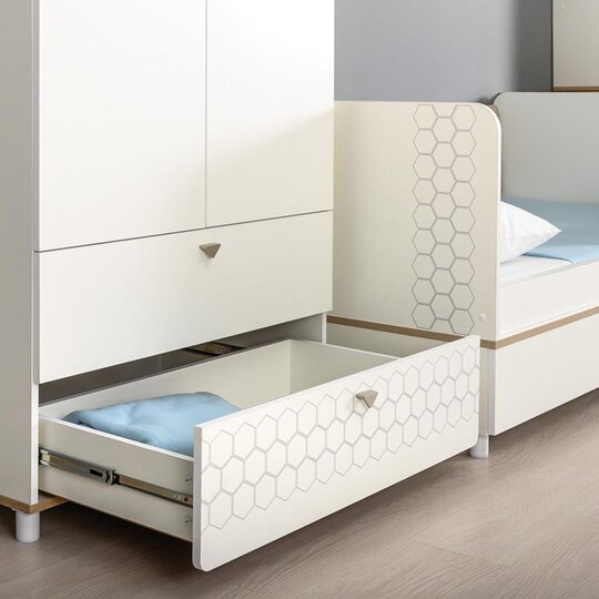 Кровать оснащена съёмным мягким элементом с карманами, передвижным бортиком и декорирована оригинальным рисунком - мультяшными пчёлками, которые никого не оставят равнодушным.
