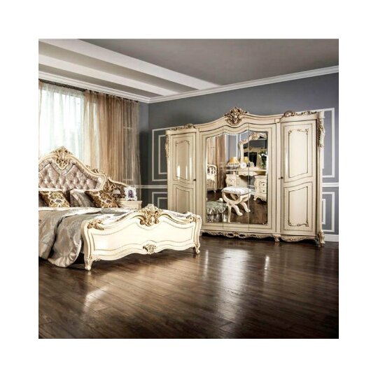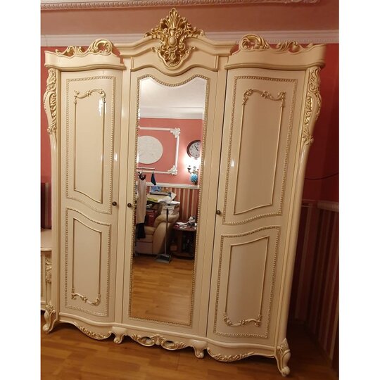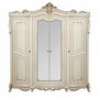 Шкаф Джоконда 4Д-роскошный четырёх створчатый шкаф с центральным отделением за распашными зеркальными дверцами и двумя боковыми отделениями за распашными дверцами. Шкаф декорирован балясинами, роскошной лепкой и фрезеровкой с золотой патиной. В основании шкафа невысокие изогнутые опоры и резная панель, а венчает шкаф высокий благородный резной карниз с лепным картушем.