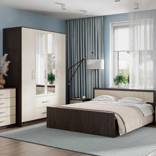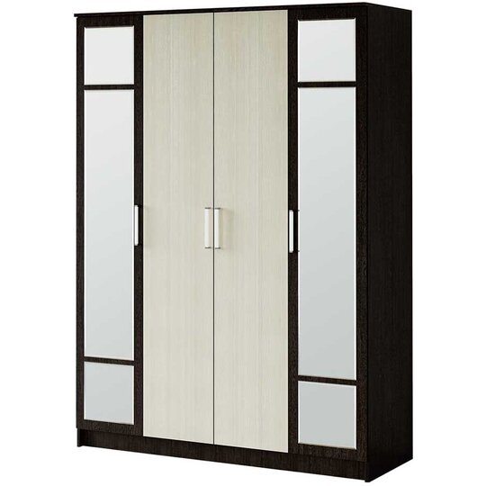 Разместить большой гардероб вы сможете благодаря четырёхстворчетому шкафу Фиеста. Vодель выполнена из ЛДСП в комбинации цветов венге и лоредо, две створки являются зеркальными, внутреннее наполнение состоит из большого центрального отделения со штангой для верхней одежды и вещей на вешалках, справа и слева от платяной зоны находятся полки, фасады оснащены эргономичными ручками, шкаф всегда можно добавить другими модулями из одноименной мебельной серии.