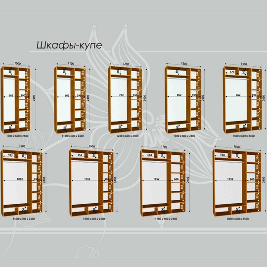 • Шкафы-купе можно заказать как в стандартных размерах высотой 2100 и 2400 мм, так же по Вашему желанию возможно изготовление шкафа-купе в не стандартном размере, с шагом в 1см по длине/глубине/высоте;