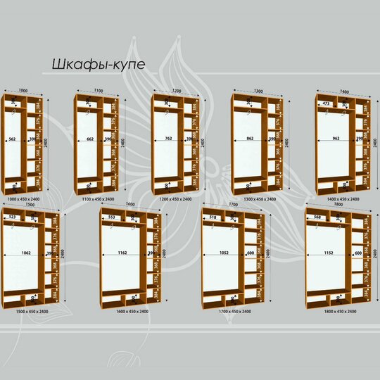 • Шкафы-купе можно заказать как в стандартных размерах высотой 2100 и 2400 мм, так же по Вашему желанию возможно изготовление шкафа-купе в не стандартном размере, с шагом в 1см по длине/глубине/высоте;