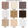 • Стандартные цвета: бук, венге темный, орех темный,дуб молочный, бодега темная,  ясень шимо светлый, ясень шимо темный, дуб сонома, белый, орех лесной, анкор темный, анкор светлый, лиственница светлая (бодега белая), дуб вотан.