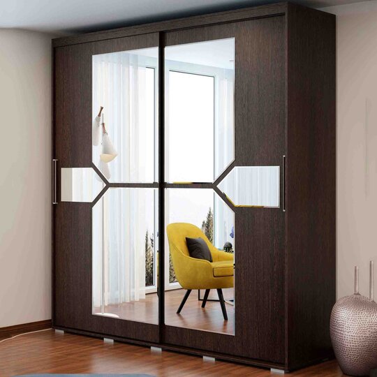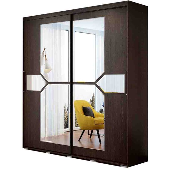Практичный и многофункциональный шкаф-купе Крафт-3 подойдет для любой комнаты вашей квартиры или дома. Две большие створки на роликовых направляющих выполнены в темном цвете венге и имеют зеркальные вставки, модель состоит из многочисленных полок и ящиков для белья и одежды, а также отделения со штангой для плечиков, наличие зеркал позволит визуально расширить пространство.
