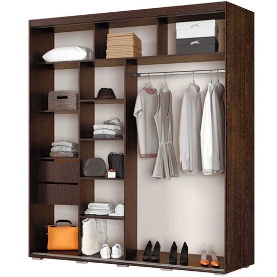 Практичный и многофункциональный шкаф-купе Крафт-3 подойдет для любой комнаты вашей квартиры или дома. Две большие створки на роликовых направляющих выполнены в темном цвете венге и имеют зеркальные вставки, модель состоит из многочисленных полок и ящиков для белья и одежды, а также отделения со штангой для плечиков, наличие зеркал позволит визуально расширить пространство.
