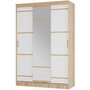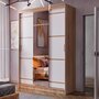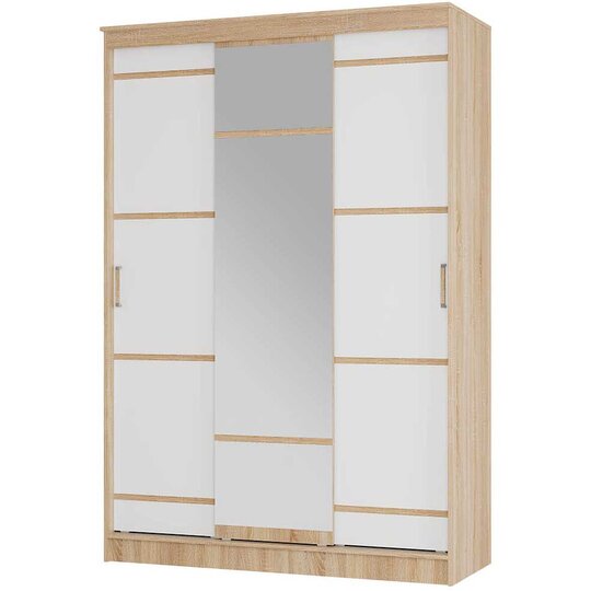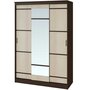 Шкаф-купе Сакура выполнен в едином стиле с остальными модулями одноимённой мебельной серии. Он сделан из ЛДСП высокого качества в комбинации цветов, раздвижные дверцы декорированы темными полосами и дополнены удобными ручками, центральная створка – полностью зеркальная. Внутри модель содержит все необходимые зоны для хранения одежды и обуви: большое отделение для плечиков, а также полки и ниши для остальных вещей.