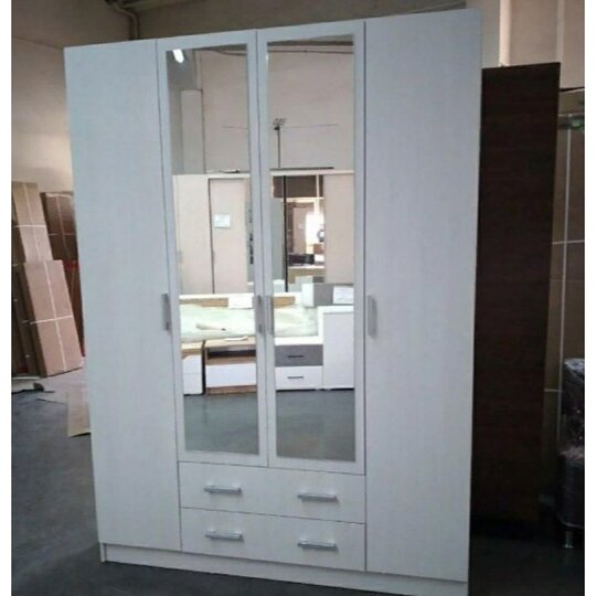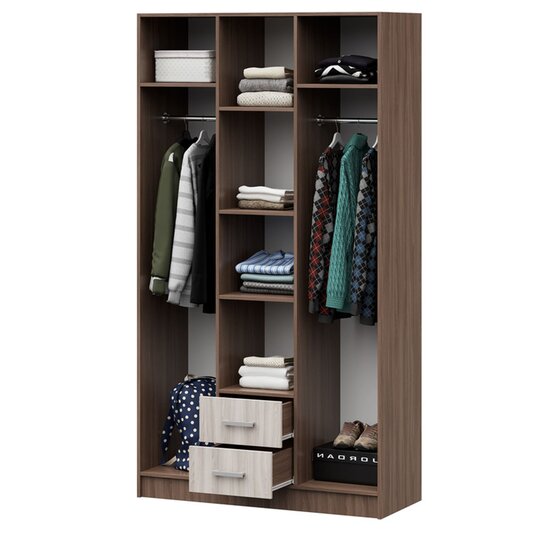 Шкаф Трио - вместительный шкаф на 3 отделения с распашными дверцами. В центральной части расположены 2 выдвижных ящика, а за дверцей с зеркалом - полки. За крайними дверцами - отделения со штангой, над которой находится полка.
