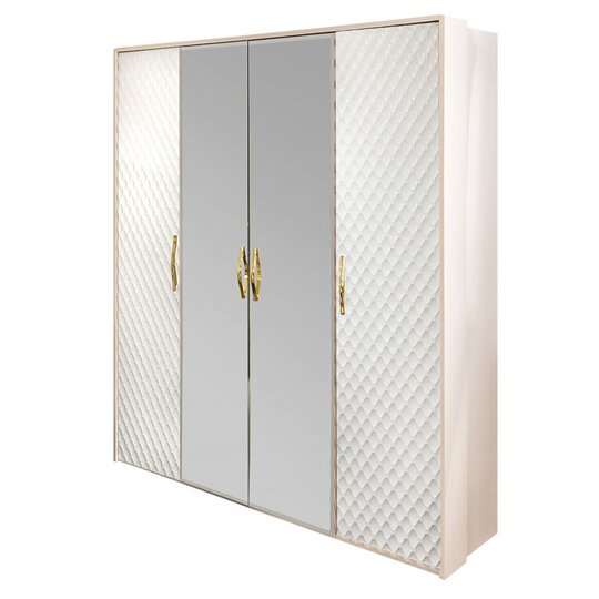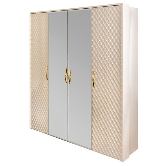 Шкаф 4 створчатый Lara- красивый вместительный модуль, прекрасно дополняющий интерьер спальни. Шкаф укомплектован штангой для одежды и полками. Двери шкафа глухие распашные, две центральные дополнены зеркалом. Корпус изготовлен из ЛДСП, фасады - МДФ с орнаментальной рельефной фрезеровкой.