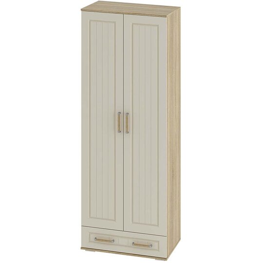 Двухстворчатый шкаф Маркиза выполнен из качественной ЛДСП цвета дуб сонома. Фасады модели изготовлены из МДФ нежного цвета крем-сатин и имеет фрезеровку, характерную для всей одноимённой коллекции мебели, модель состоит из нижнего выкатного ящика, двух распашных дверок, за которыми находится отделения с хромированной штангой и вместительная верхняя полка.
