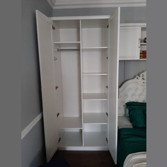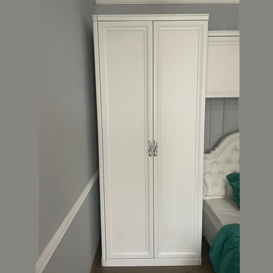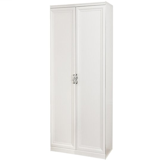 Шкаф-элегантный комфортный шкаф в классическом стиле с отделением с четырьмя полками и отделением со штангой и антресольной и нижней полками за двумя распашными дверцами. Шкаф выполнен в белой матовой тонировке с фрезерованными рамочными фасадами. В основании - солидный цоколь. Лицевая фурнитура - фантазийные хромированные ручки-скобы.