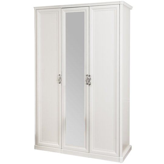 Шкаф Мишель- элегантный трехстворчатый шкаф, скомпонованный из двустворчатого и одностворчатого шкафов и стоевых из комплекта мебели Мишель. Центральная распашная дверца оборудована зеркалом, боковые - глухие распашные. Завершают оформление - карниз, массивное основание и витиеватые металлические ручки. Дополнительно шкаф можно доукомплектовать полками со штангой.