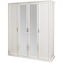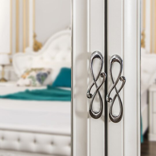 Шкаф Мишель - элегантный четырехстворчатый шкаф, скомпонованный из одного двустворчатого шкафа и двух одностворчатых и стоевых из комплекта мебели Мишель. Четыре распашные дверцы имеют рамочные фасады с лаконичной фрезеровкой  и витиеватые металлические ручки. На дверцах зеркала. Завершают оформление - карниз и массивное основание. Шкаф оснащен штангами.