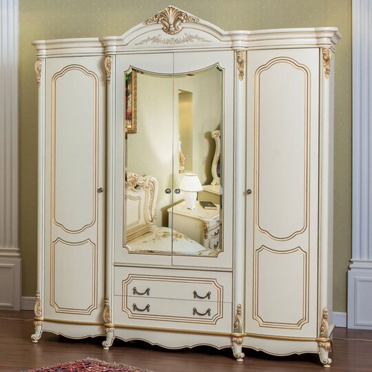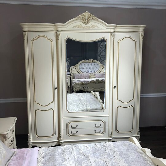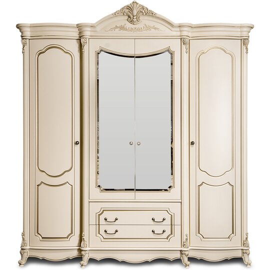 Шкаф Мона Лиза-роскошный и комфортный четырехстворчатый шкаф выполнен с центральным отделением со штангой за двумя зеркальными дверцами, расположенном над двумя выдвижными ящиками, и с двумя боковыми отделениями с полками за распашными дверцами.