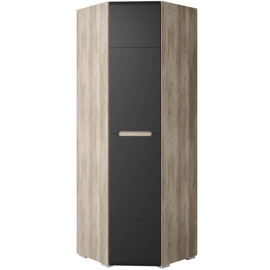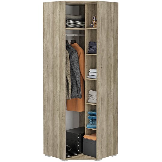С умом использовать пространство поможет угловая модель шкафа Наоми из одноименной модульной серии. Изделие выполнено из ЛДСП, фасад распашной дверцы состоит из МДФ белого/серого цвета и имеет встроенную ручку, внутри шкаф разделен на две зоны для размещения одежды на вешалках и хранения сложенных вещей на полках.