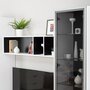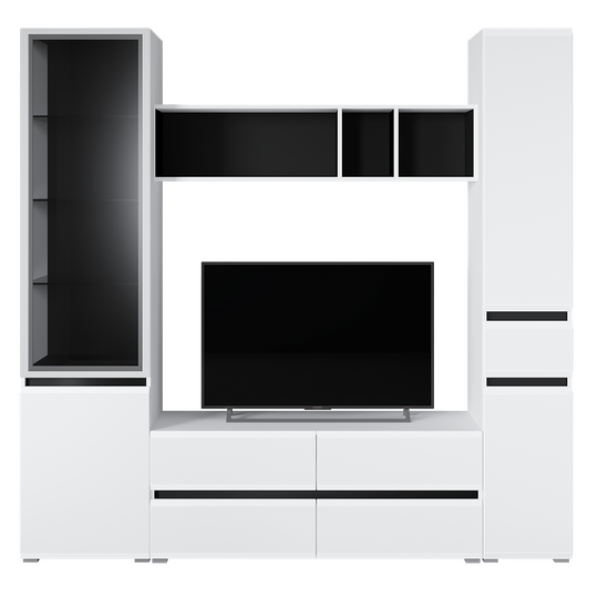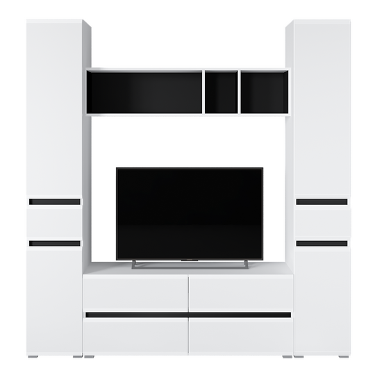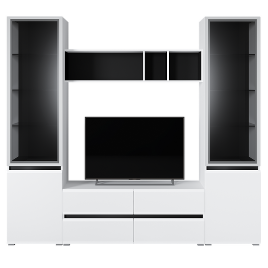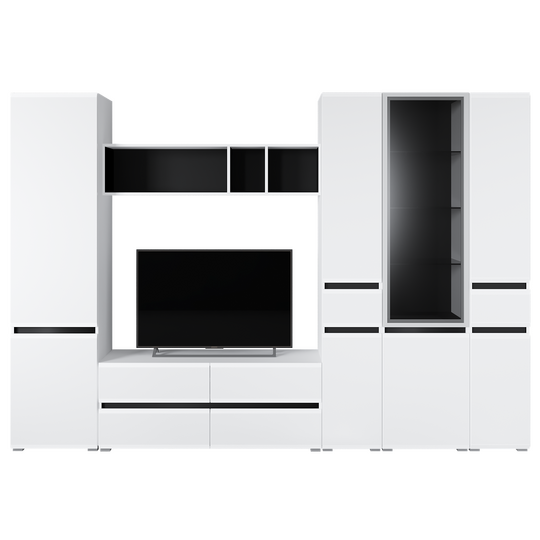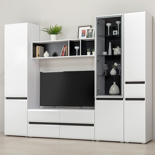 Современное, модное и стильное решение для гостиной - коллекция Сидней. Лаконичные белые глянцевые фасады создают ощущение чистоты и свежести, лёгкости, свободного пространства. Акцентом выступают чёрные горизонтальные вставки между фасадами и серое тонированное стекло витрины. Фасады могут открываться за край, либо нажатием, с помощью механизма push-to-open. Все распашные фасады оснащены доводчиками, что обеспечивает плавное закрывание и исключает удар о корпус.