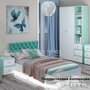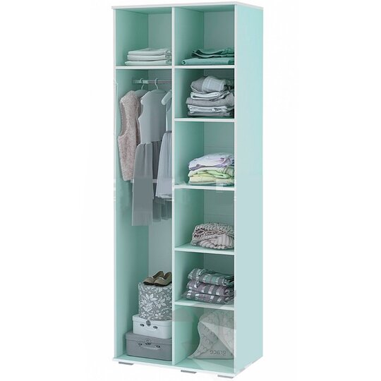 Шкаф 2-х ств. ШК-09 Тифани BTS имеет две секции для размещения одежды: с полками и со штангой. Нежно-бирюзовый тон корпуса шкафа Тифани в обрамлении снежно-белой кромки идеально гармонирует с белыми фасадами, украшенными ювелирными ручками.
