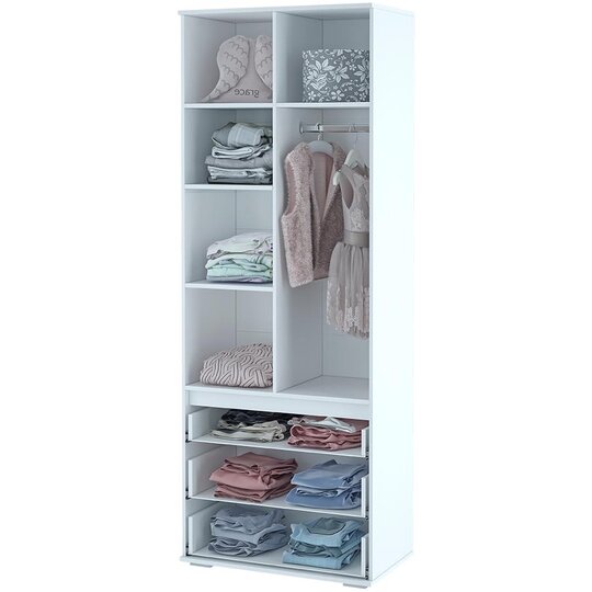 Шкаф ШК-07 «Тойс» БТС  - имеет три выдвижных ящика, штангу и полки, в нем удобно разместить одежду, белье и игрушки.