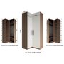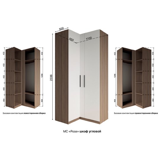• Базовая комплектация углового шкафа состоит из корпуса, четырех узких полок в меньшей секции, двух полок в большой секции и одной штанги.