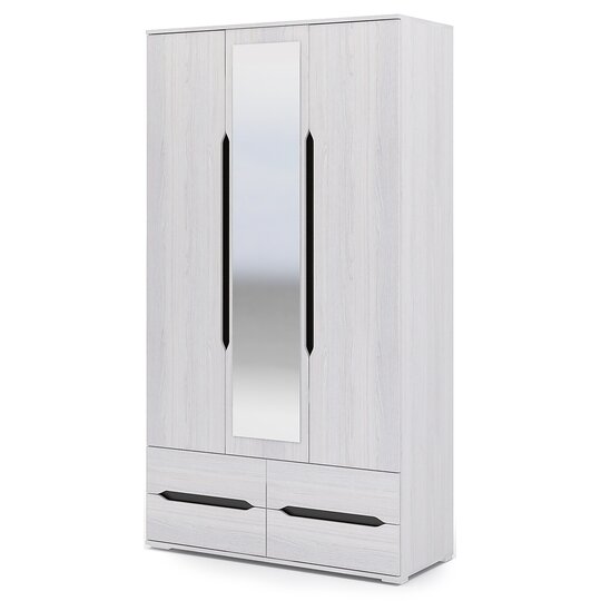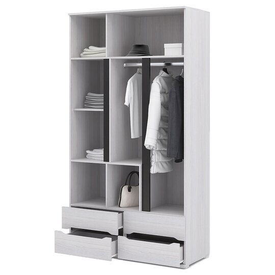 Необычный образ распашного шкафа исполнен в стиле минимализм, но при этом обладает незаурядным функционалом. За дверцами расположилась удобная штанга для вешалок с одеждой, полки, а также антресольная полка для головных уборов и сумок. В нижней части четыре ящика, в которых будет удобно хранить как обувь, так и аксессуары.  Выемки вместо ручек делают шкаф безопаснее и удобнее в использовании.