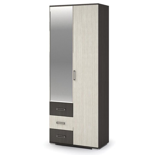 Стильный трехстворчатый шкаф Яна порадует Вас своей функциональностью и интересным сочетанием расцветки. Вместительный и функциональный, шкаф будет отлично смотреться не только как элемент модульной гостиной Яна, но и в любой другой комнате. Имеет пять полок, три выдвижных ящика, штангу для одежды на вешалках, верхнюю полку для хранения вещей.