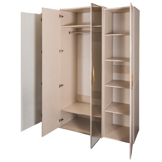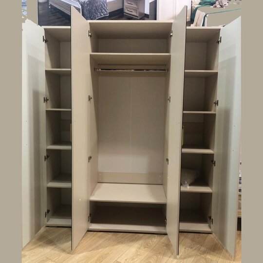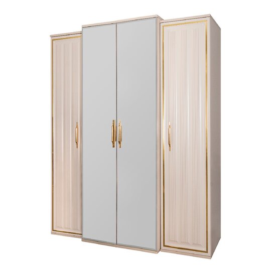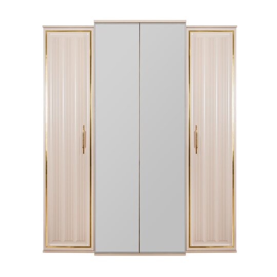 Внутреннее наполнение шкафа выполнено по стандартам гардеробной и укомплектован полки для белья и штанга для одежды. Фасады оснащены фурнитурой с доводчиком и  украшены металлизированным латунным декором — этот тренд сезона является авторским стилем фабрики Эра и такой же декор используется в спальне Lara – это расширяет возможности и позволяет миксовать коллекции новинок. Шкафы выпускаются 4х (1+2портал+1) и 5ти (1+3портал+1) створчатые самые функциональные варианты.