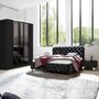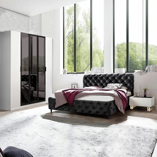 Спальня Наоми - особенная коллекция. В ней сочетаются современные тенденции и экзотический колорит, мужественность и грация. Уютная, с модным сочетанием цветов. Корпус в цвете черный выгодно подчеркивает орнаментальную фрезеровку! Кровать интерьерная с мягким изголовьем   – делает ее центром притяжения! Ведь кровать в спальне главный элемент мебели! Мебель на ножках в цвете золота выглядит воздушной, не утяжеляет модули, обеспечивает легкость пространства! Наоми-находка для любителей не обычного сочетания классики и лофта!