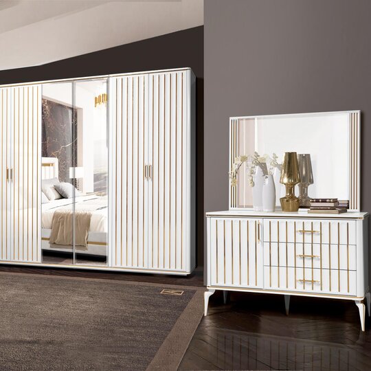 Цвет:белый/белый Спальное место:1800*2000 Материал корпуса:ЛДСП Материал фасадов:МДФ Шкаф:6-створчатый Гарантия:12 месяцев Бренд:Слониммебель