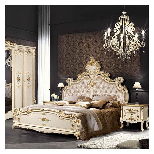 Изголовье просторной кровати драпировано велюром, а каретная стяжка веками является олицетворением богатства. Просторный 6-ти дверный шкаф с зеркалами в пол украшает нежный цветочный орнамент. Туалетный стол оснащен выдвижными ящиками для уходовой косметики, парфюмов, журналов, а роскошное зеркало обрамлено золоченой лепниной. Изогнутые ножки прикроватной тумбы, пуфа, кровати придают массивной мебели ощущение легкости. Все декоративные элементы гарнитура "Валенсия"  хорошо сочетаются между собой, образуя единую экспозицию.