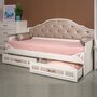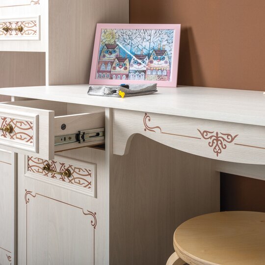 Детская модульная система "Флоренция" привлекает внимание классической геометрией и узорчатой фотопечатью. Фасады дополнительно украшены декоративным профилем. Картину дополняют изящные металлические ручки в цвете "старое золото" и мягкие элементы дивана-кровати, подушки-конфетки. Девочкам особенно понравится стеллаж - удобная система хранения и так необходимое зеркало.