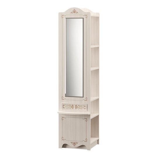 Стеллаж Флоренция-очень нарядный мебельный модуль с красивым фигурным фасадом, - займет одно из центральных мест в детской. Стеллаж оснащен пятью открытыми секциями, фасадом с зеркалом и изящной полочкой. Корпус и фасад изготовлены из ЛДСП 16 мм в цвете ясень анкор светлый, фасад дополнительно украшен узором цветной фотопечати и резными элементами. Оригинальная конструкция стеллажа позволит использовать его в игровой зоне для размещения игрушек и любых других предметов, а также в гардеробной зоне в качестве идеального трюмо.