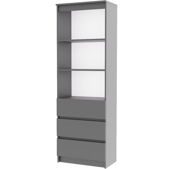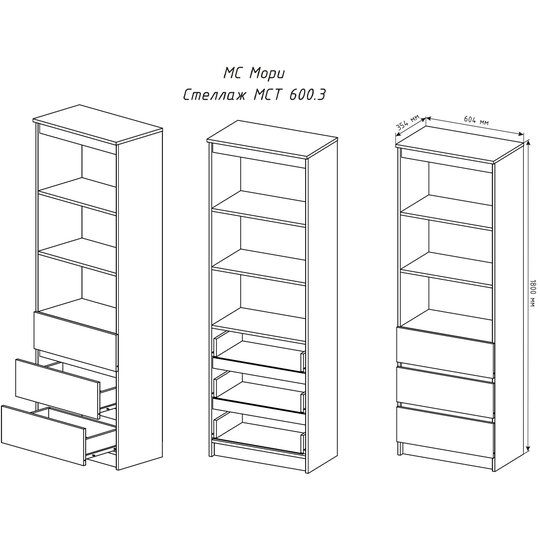 Стеллаж Мори МСТ 600.3 - небольшой, но многофункциональный современный стеллаж. Корпус и фасады выполнены из ЛДСП белого/серого цвета. Состоит из верхней части: три открытые полки, нижней части: три выдвижных ящика на роликовых направляющих. На фасадах ящиков отсутствуют ручки, функцию ручек выполняет сам фасад (его верхняя часть с внутренней стороны прямая под углом 90°). Открывание ящиков производится за счет пространства между планками и фасадами. Зона хранения ящика 51х28.6х10 см. Глубина ящика 30.2 см. Информация от производителя: Обращаем ваше внимание, что рассверловка боковин ящиков является односторонней (по левой стороне).