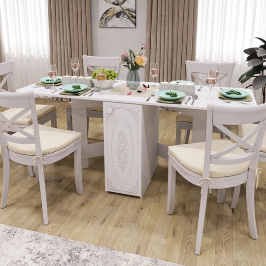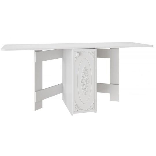 Стол раскладной СМ-5 оснащен двумя полками, удобным шкафчиком для хранения разных мелочей. Мебель изготовлена из качественной ламинированной ДСП 16 мм. В оформлении фасадов МДФ применяется уникальная технология нанесения объемного узора (3D).
