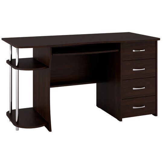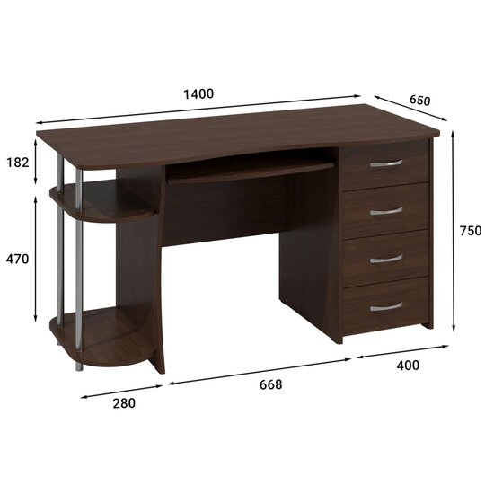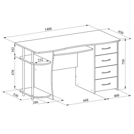 Компьютерный стол С-222БН предусматривает место для монитора, имеются четыре ящика, выдвигающаяся полка для клавиатуры и место для системного блока. Сборка тумбы с ящиками только с правой стороны. Фурнитура: телескопические направляющие полного выдвижения.