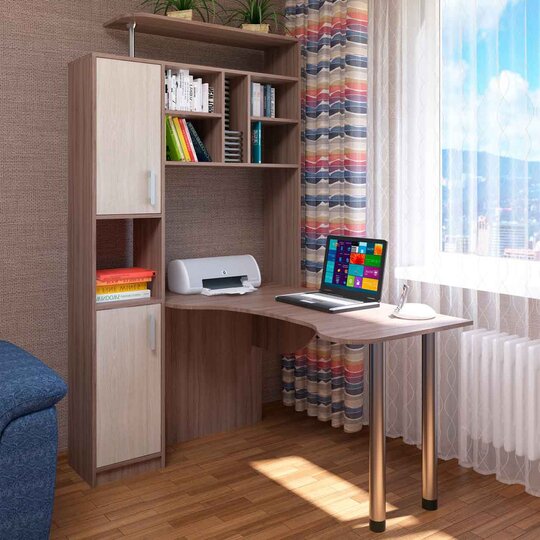 Стол компьютерный угловой СК-14 удобный и вместительный. Помимо привычных столешницы и полок, здесь присутствует пенал с распашными дверцами. Его визуально разделяет на две части открытая ниша. Также стол имеет надстройку, образующую удобную конструкцию с множеством открытых полок и место для CD-дисков. На крыше надстройки можно разместить акустическую систему или дополнительную технику, документы и сувениры. Если говорить об основном элементе, столешнице, то она имеет фигурную форму, благодаря чему рабочее пространство является большим и удобным. Столешница с одной стороны опирается на две металлические регулируемые по высоте ножки цвета хром. Эти элементы делают конструкцию современной и эстетически привлекательной. Данная модель стола будет интересна как для дома, так и для офиса.   Стол можно собрать как левым, так и правым (универсальная  сборка ).
